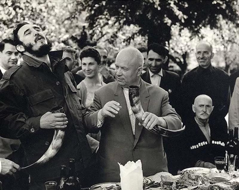 1962年古巴導彈危機,翌年古巴領(lǐng)導人卡斯特羅訪問蘇聯(lián),時任蘇聯(lián)領(lǐng)導人赫魯曉夫在格魯吉亞用獸角杯招待客人。