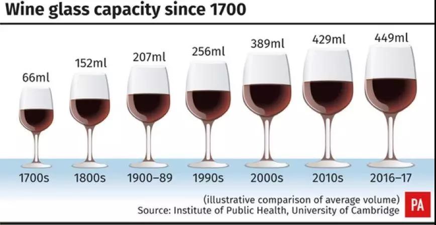 劍橋大學的一項研究發(fā)現(xiàn),在過去300年里,酒杯的容量增加了7倍,而且在最近20年里增幅最大。
