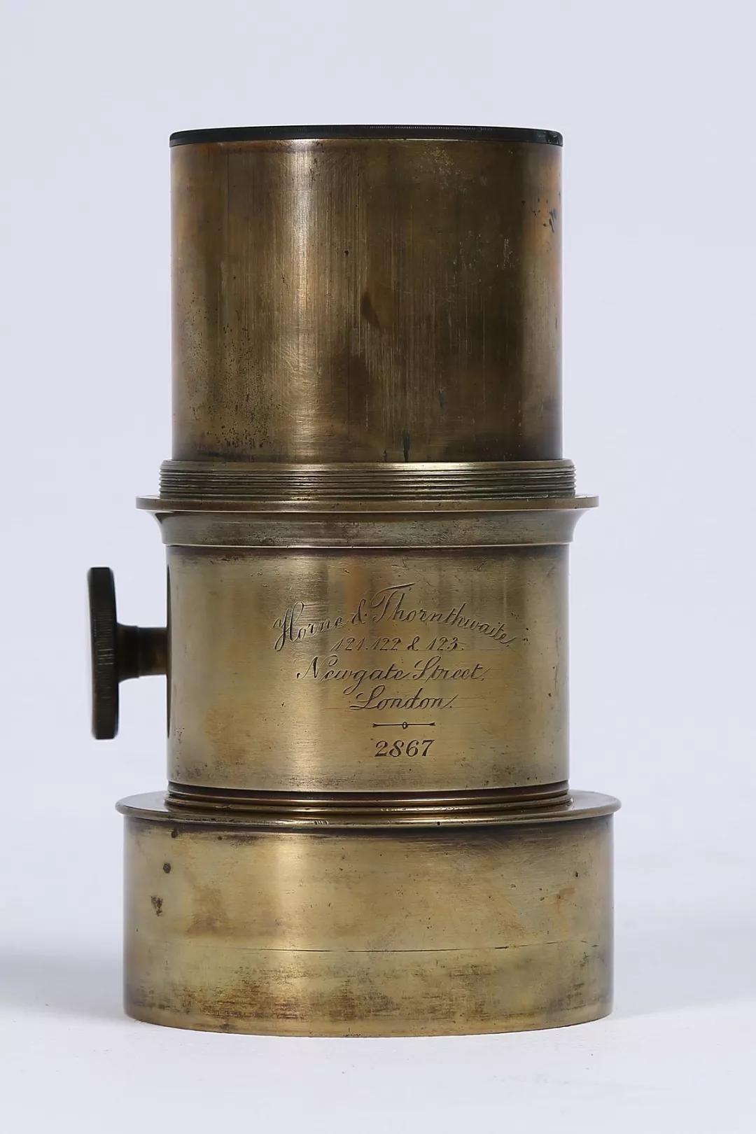 相機(jī)片夾(匣)缺失。鏡頭為匹茲伐(Petzval)250mm F4.5 人像鏡頭(圖 06),鏡頭編號(hào):2867,由英國(guó)霍恩公司于 1841 年至 1842 年制造。這只鏡頭由黃銅制成,又大又重,側(cè)面有個(gè)旋鈕用來調(diào)焦(圖 07)。