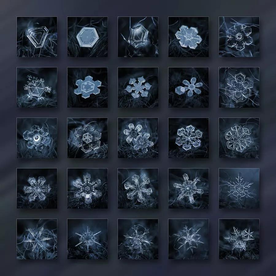 在他的微距鏡頭下,紛紛揚(yáng)揚(yáng)的一場場雪被“拆碎”,形態(tài)各異的冰晶呈現(xiàn)出各式形狀規(guī)整、樣式精美的圖案,在讓人沉迷于雪花無限美麗與夢幻的同時,亦讓人不禁贊嘆大自然的神奇。