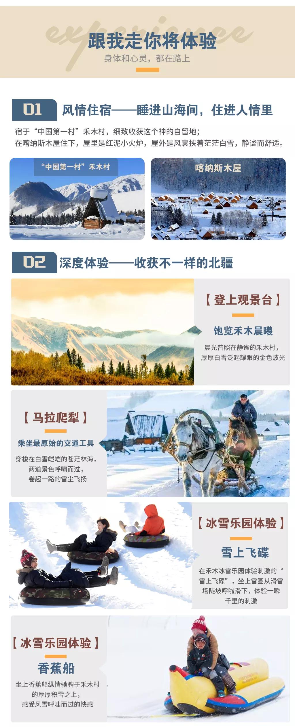 4、贈(zèng)送禾木村冰雪樂園中的滑雪或香薰船體驗(yàn),如游客想?yún)⒓悠渌鼕蕵讽?xiàng)目費(fèi)用敬請(qǐng)自理。