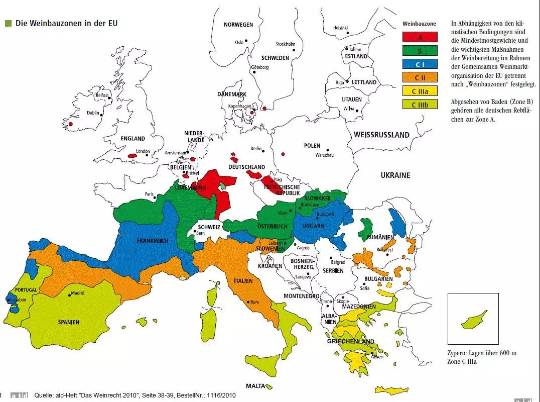 上眼看這張歐盟27國葡萄酒產區(qū)劃分圖(依據氣候)。