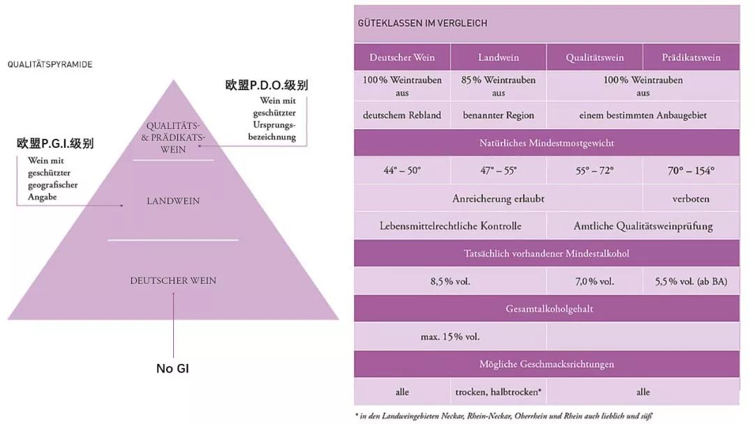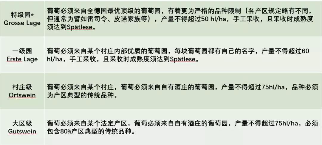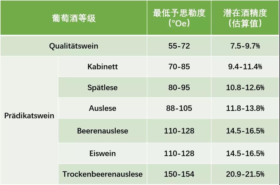 1971年,德國頒布了一套葡萄酒分級法規(guī):葡萄采收時成熟度(最低含糖量,以予思勒度°Oe)越高,對應葡萄酒的等級就越高。