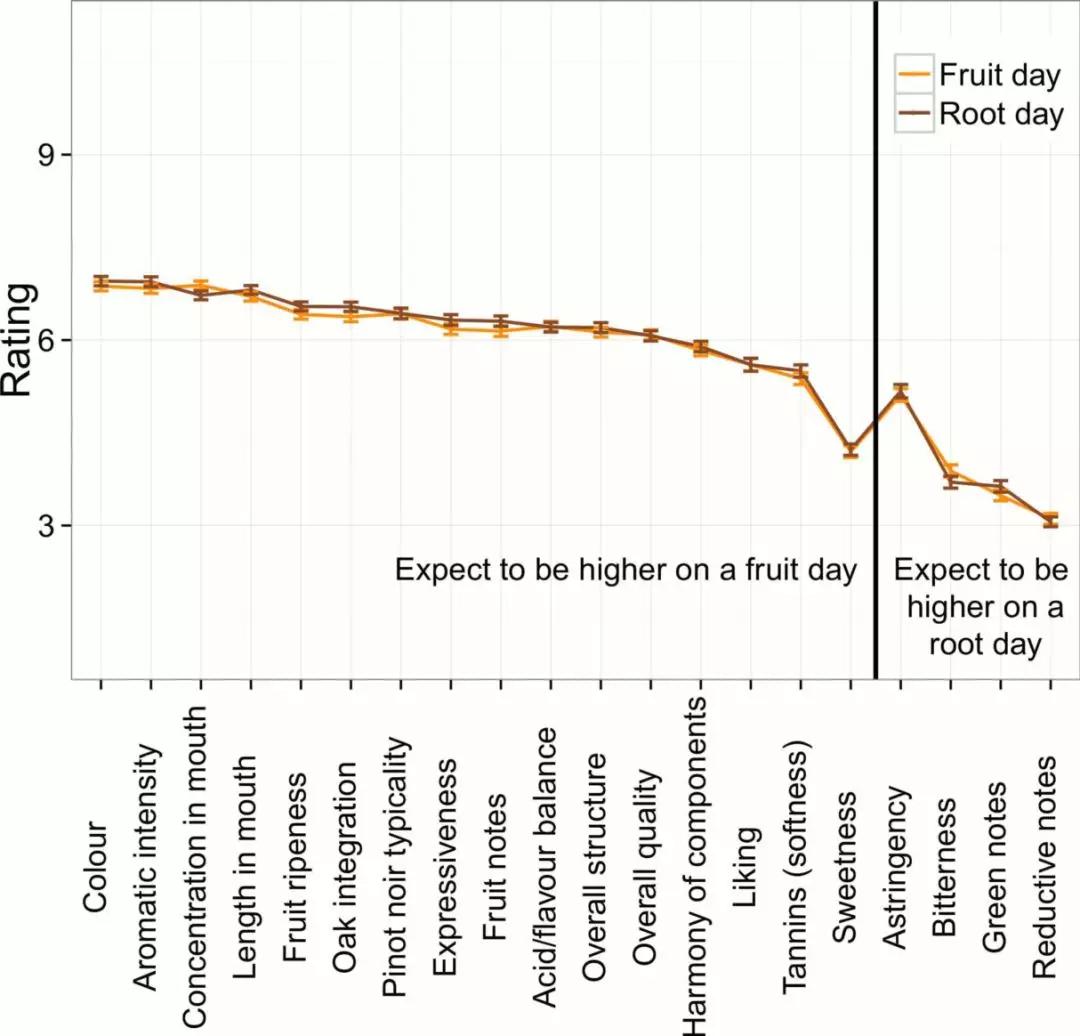 這還沒(méi)完,更有意思的是,整個(gè)實(shí)驗(yàn)里唯一表現(xiàn)出具有統(tǒng)計(jì)學(xué)意義差異的不是根日與果日之間,而是同樣的酒款在兩次根日之間、兩次果日之間表現(xiàn)出的顯著差異。
