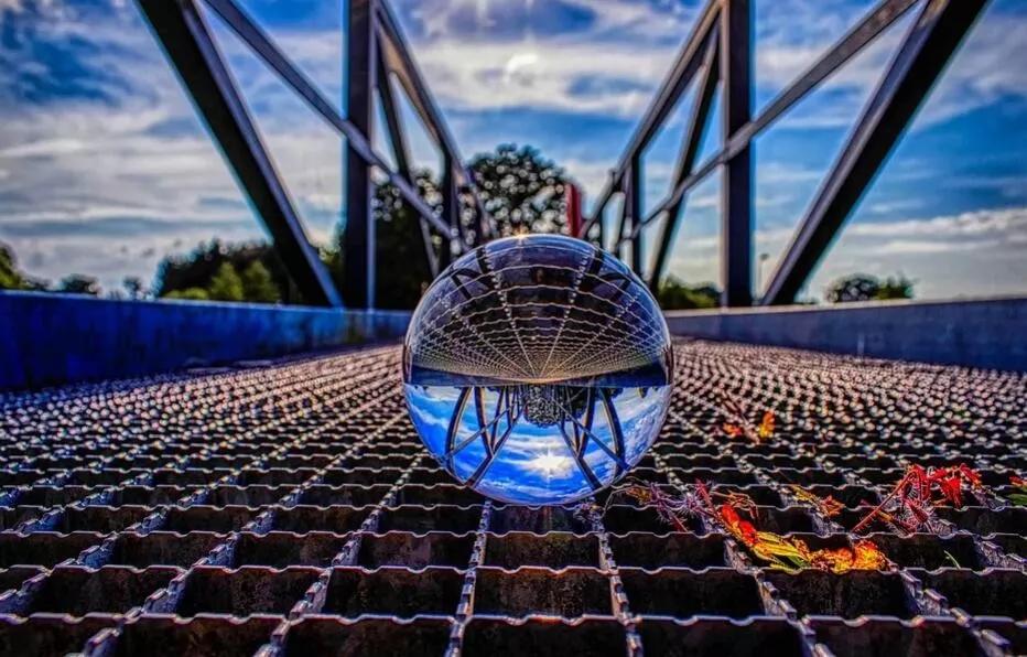 最后這張照片是利用了一個水晶球,通過了低角度拍攝有線條,有節(jié)奏的鋼鐵結(jié)構(gòu)。我們就在一些場景中,用水晶球去營造一些特殊的效果,就不用后期做這個效果了。