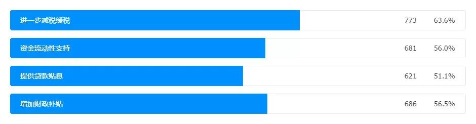 根據(jù)數(shù)據(jù)可以看出,參與調(diào)查的企業(yè)認(rèn)為,當(dāng)前企業(yè)主要面臨的經(jīng)營(yíng)困難主要是集中在資金等問(wèn)題上,面對(duì)收入急劇減少,人工成本反而增高的前提下,大多數(shù)民營(yíng)企業(yè)最需要的,是更多的稅費(fèi)減免及政府補(bǔ)貼支持。
