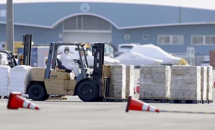 工作人員準(zhǔn)備為郵輪運(yùn)送物資