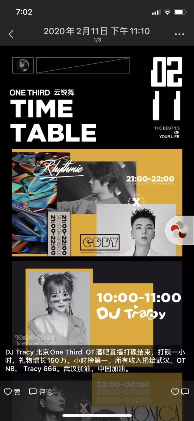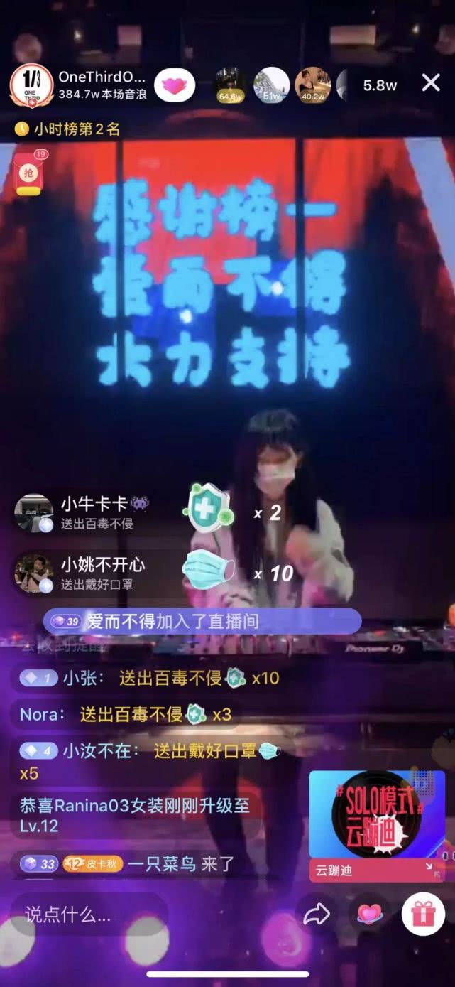 作為一家夜店的招牌之一,DJ們的日子也并不好過。2月11日,ONETHIRD在直播中邀請(qǐng)了嘉賓DJ Tracy。當(dāng)晚,Tracy創(chuàng)下了1小時(shí)收入150萬音浪的成績(jī),價(jià)值約15萬人民幣,一同歸入了ONETHIRD的公益通道。