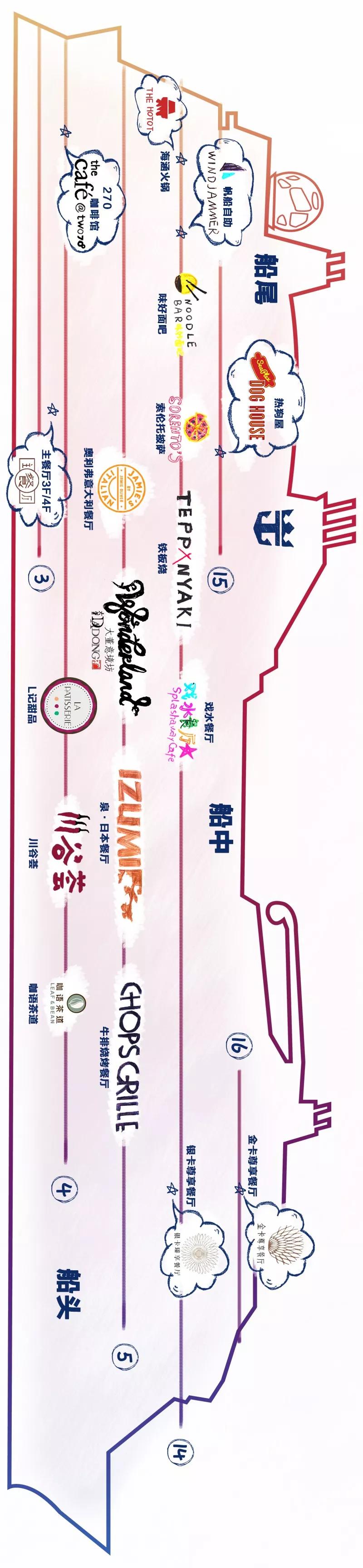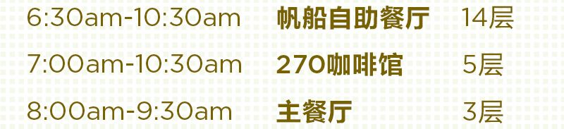 早餐你可以任選以上三家餐廳,有自助也有點(diǎn)餐,滿足你不同的早餐需要,強(qiáng)小花貼心提示:船上超多好玩項(xiàng)目,只要吃飽了才有力氣一個(gè)個(gè)玩過(guò)來(lái)哦~