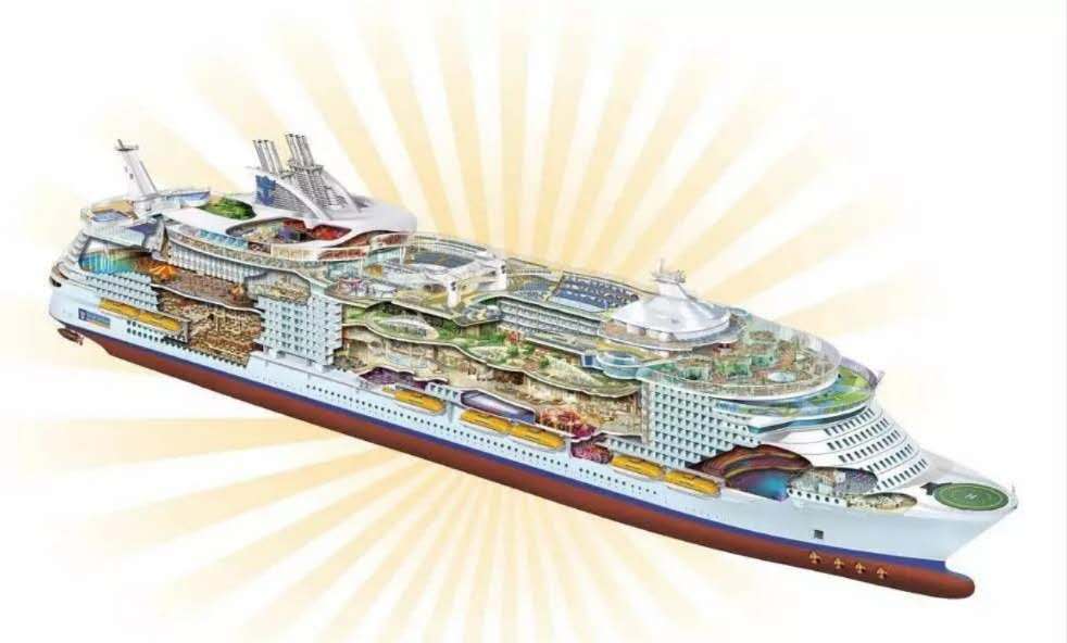 從總噸位來說,現(xiàn)代世界上最大郵輪無疑是皇家加勒比郵輪公司總噸位超過22萬綠洲級系列郵輪。