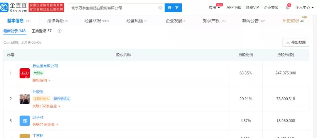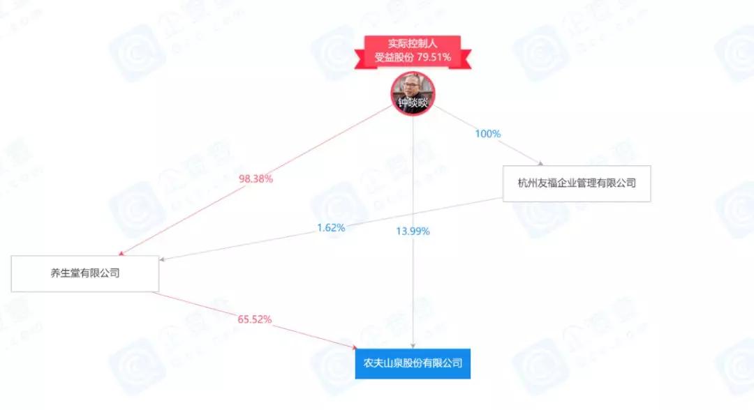根據(jù)企查查資料顯示,鐘睒睒名下的養(yǎng)生堂,有一家名為萬泰生物的公司,從萬泰生物招股書可以了解到,農(nóng)夫山泉的大股東養(yǎng)生堂持股 65.5223%、鐘睒睒持股 13.9937%、其他股東持股 20.4840%。養(yǎng)生堂是核心的控股型平臺公司,鐘睒睒持股98.38%,另外通過其全資控股的杭州友福持有1.62%股權,也就是說,養(yǎng)生堂由鐘睒睒100%控股。