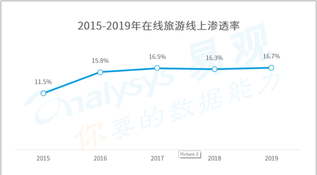 另一方面,隨著信息技術(shù)的普及,互聯(lián)網(wǎng)已經(jīng)滲透到生活的方方面面。旅游用戶可以借助互聯(lián)網(wǎng)了解各旅游場景的需求信息,如交通、住宿、景區(qū)門票等,并通過互聯(lián)網(wǎng)完成預(yù)訂、購買旅游產(chǎn)品等環(huán)節(jié)。旅游消費(fèi)習(xí)慣線上遷移,推動(dòng)在線旅游市場規(guī)模持續(xù)增長。在線旅游線上滲透率保持穩(wěn)定增長,2019年達(dá)到16.7%。用戶對(duì)旅行社在產(chǎn)品價(jià)格、服務(wù)等方面存在諸多不滿,同時(shí),用戶的旅游消費(fèi)互聯(lián)網(wǎng)化的使用習(xí)慣已經(jīng)養(yǎng)成,導(dǎo)致線上預(yù)訂逐漸取代旅行社地位的現(xiàn)象。另外,在線旅游企業(yè)通過市場下沉戰(zhàn)略來獲取新增流量,以攜程為例,旗下攜程旅游門店、去哪兒門店、旅游百事通門店三品牌合計(jì)約8000家門店,覆蓋超過28個(gè)省(直轄)市。在互聯(lián)網(wǎng)化的大趨勢下,造成線下旅行社“消”而在線廠商“漲”的局面。