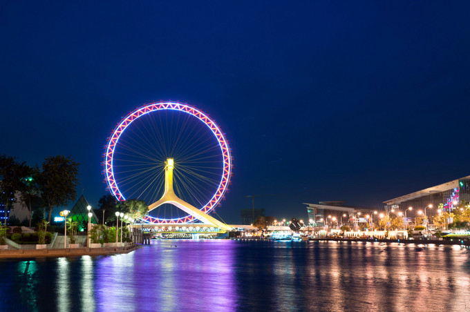 天津之眼坐落在天津市紅橋區(qū)海河畔,是一座跨河建設(shè)、橋輪合一的摩天輪,兼具觀光和交通功用。摩天輪旋轉(zhuǎn)一周所需時(shí)間為28分鐘,到達(dá)最高處時(shí),周邊景色一覽無余,甚至能看到方圓40公里以內(nèi)的景致。直徑為110米,輪外裝掛48個(gè)360度透明座艙,每個(gè)座艙可乘坐8個(gè)人,可同時(shí)供384個(gè)人觀光。轉(zhuǎn)動(dòng)速度緩慢,并不刺激。你可眼見車輛從兩邊疾馳而過,別有妙趣。