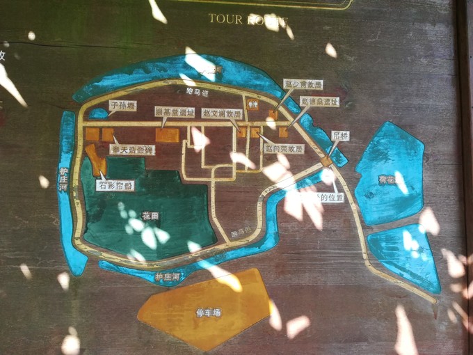 村口的全莊地圖,推薦停車在莊門,莊門進莊門出,幸存古屋集中在中心巷道東側(cè),南邊主要是花田。