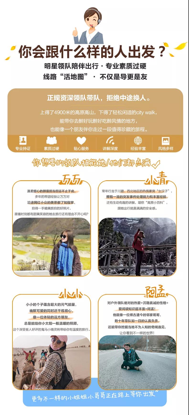 私人訂制:我們業(yè)務范圍囊括了全國各大城市,川西、西北、東北,在路上永遠有我們的身影。我們將為每一個有定制需求的你策劃出獨屬于自己的完美旅行。