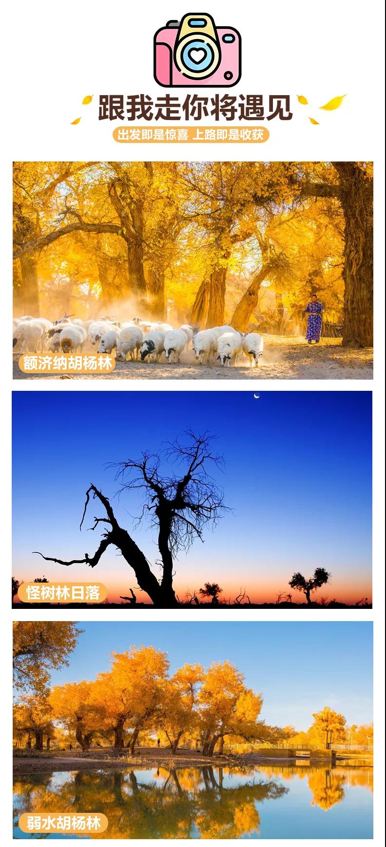 隨后我們在【額濟納胡楊林景區(qū)】中自行游玩攝影創(chuàng)作,胡楊有“生而一千年不死,死而一千年不倒,倒而一千年不朽”的說法,被世人稱為英雄樹。千姿百態(tài)的胡楊遍布在沙漠中,漫步輝煌的金秋胡楊林,用鏡頭記錄這中國最美的秋景;或者去找尋導游所說的一樹三葉的神奇景象——“幼樹葉如針似柳眉、壯齡樹葉酷似白樺、老年樹葉橢圓”,胡楊、藍天、來自大漠腹地的風聲襲來之時,胡楊林便泛起黃澄澄的層層漣漪,顯盡大西北秋冬那紅盛翠減的獨有風情。張藝謀的大片《英雄》中張曼玉與章子怡身著紅衣在這漫天的金色胡楊中打斗,踱步在胡楊林,熒屏內的唯美畫面一一浮現。