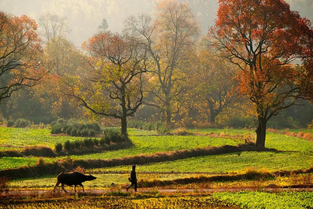 塔川烏桕樹(shù)經(jīng)過(guò)霜降,由綠變黃,由黃變紅,漸變出調(diào)色板般豐富的色彩。塔川的清晨極美,薄薄的霧氣似有似無(wú),籠罩在山腰,林間,農(nóng)家的小屋若隱若現(xiàn),紅楓叢中小露飛檐翹角,黃葉微隙掩映粉墻黛瓦,如中國(guó)山水畫般詩(shī)情畫意。