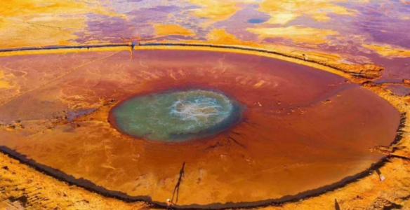 隨后我們前往阿拉爾草原深處去探索一方汩汩噴涌了上千年的地熱噴泉——【“惡魔之眼”艾肯泉】?!鞍稀痹诿烧Z中意為“可怕”,而“艾肯泉”在蒙語中又意為“源頭”,因其湖水成分艾肯泉周圍寸草不生且形成了一個紅褐色的圓形,正中央便是汩汩而出的泉水,這便形成了一個巨大的“眼睛”,被人稱為“大地之眼”。從空中俯瞰航拍,這巨大的眼睛脈絡(luò)清晰,栩栩如生,在它周圍點綴著許多青色的小泉眼,神秘而震撼;除了其令人驚奇的血色眼睛造型,艾肯泉還有神奇的“喊泉”屬性,據(jù)說站在岸邊朝它大喊,或者是在岸邊跺跺腳,噴泉口的水流量就會加大,會噴涌得更高。