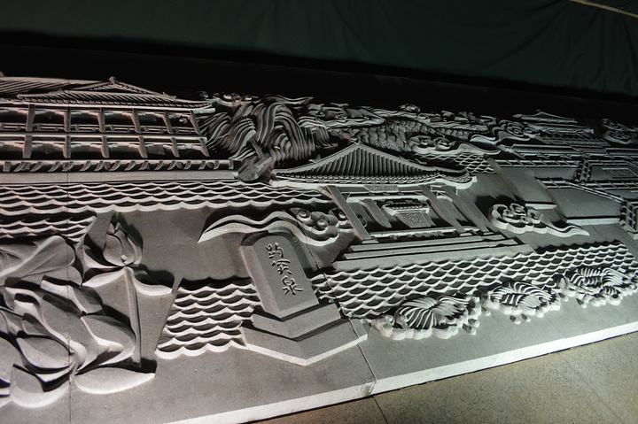 《泉城攬勝》浮雕位于廣場(chǎng)中部、下沉廣場(chǎng)東側(cè),長30米,寬2.5米,選自珍珠白花崗石雕刻而成。浮雕以多場(chǎng)面組合的構(gòu)成手法,將泉城“三大名勝”、“四大泉系”、“齊煙九點(diǎn)”、“靈巖圣境”、“四門古塔”、“龍山文化”等景觀和文脈融為一體,充分體現(xiàn)了“山、泉、湖、城、河”泉城特色,展示了泉城濟(jì)南豐富多彩、古老莊重的文化風(fēng)貌。