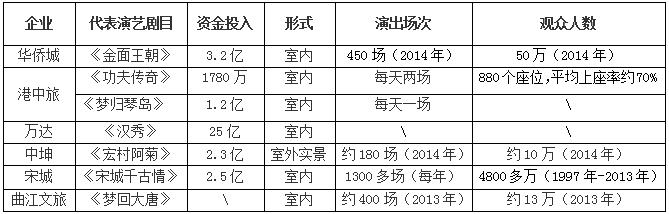 同樣進(jìn)入較早的華僑城集團(tuán),在做深圳錦繡中華項(xiàng)目時(shí)便開始打造演藝演出。2012年,華僑城曾計(jì)劃將旗下旅游演藝業(yè)務(wù)單獨(dú)上市,其當(dāng)時(shí)做的一份報(bào)告顯示,華僑城目前擁有專業(yè)演職人員2600名,上演原創(chuàng)節(jié)目26臺,累計(jì)推出各類原創(chuàng)節(jié)目57臺,累計(jì)演出63000場次,累計(jì)接待觀眾7600萬人次,已經(jīng)發(fā)展成為全國演出節(jié)目最多、演員數(shù)量最多的旅游集團(tuán)。