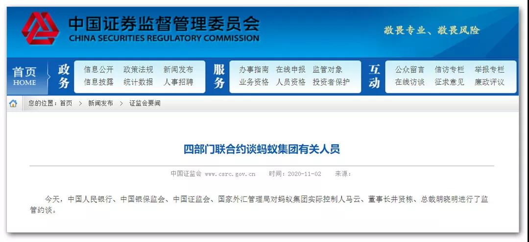 11月2日,中國人民銀行、中國銀保監(jiān)會、中國證監(jiān)會、國家外匯管理局齊聚一堂,約談螞蟻金服實(shí)際控制人馬云、董事長井賢棟。