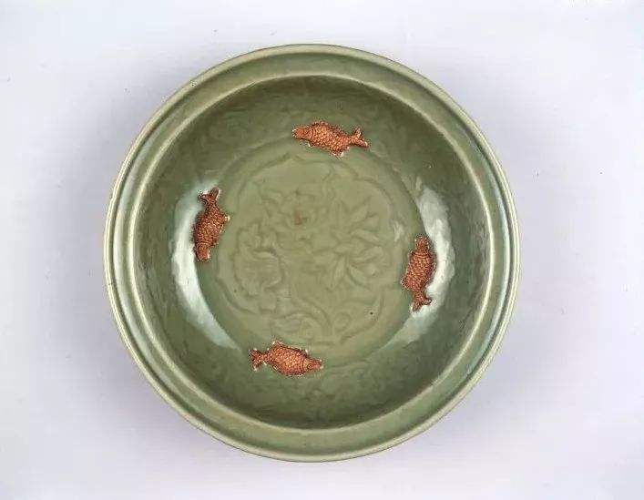 此洗敞口,折沿,圈足。洗心內(nèi)塑貼兩條游魚,外壁刻凸菊瓣紋一周??谘貎蓚?cè)各有兩個穿孔,相互對應(yīng),可用于穿飾金屬提環(huán),以便于提攜。此器釉色青翠,塑貼魚紋清晰,是南宋龍泉窯的典型作品。在韓國新安海底沉船中亦發(fā)現(xiàn)有類似器物。