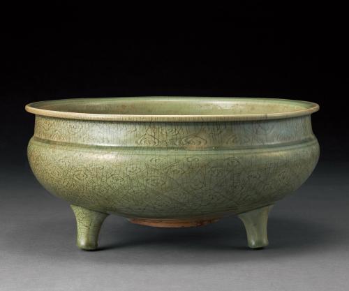 明代龍泉青瓷走向衰弱,器物胎體厚重,制作粗糙,胎色為灰黃,釉層厚,透明度高,釉表光澤強,釉色有青灰、茶葉末、灰黃等幾種,裝飾以釉下刻花為主,亦有模印人物故事的裝飾方法。