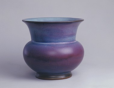 鈞釉的紅色是由于還原銅的呈色作用。紅釉中含有0.1~0.3%的CuO(氧化銅),還含有一定數(shù)量的 SnO2(二氧化錫)。在天藍、天青和月白色釉中,CuO含量極低,只有0.001~0.002%,和一般白釉中的含量相近,鈞釉的紫色是由于紅釉與藍釉互相熔合的結(jié)果,鈞瓷的紫斑是由于在青藍色的釉上有意涂上一層銅紅釉所造成的。