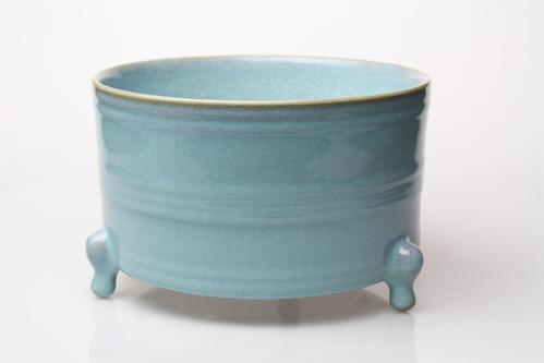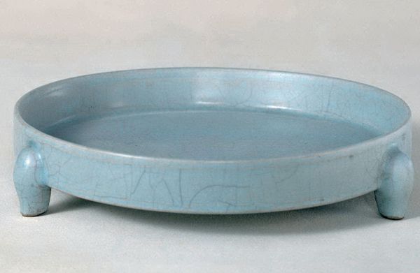 此器造型規(guī)整,釉呈淡天青色,柔和溫潤。它應(yīng)與三足樽配套使用,用以承放三足樽。