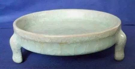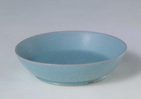盤撇口,淺弧壁,坦底,圈足外撇。通體內(nèi)外施天青色釉,釉面開細(xì)碎片紋。因采用“裹足支燒”,因此外底留有3個細(xì)小支釘痕。