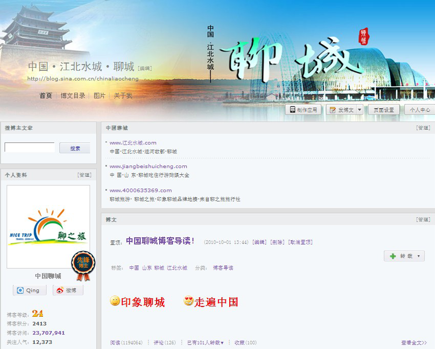中國聊城 http://blog.sina.com.cn/chinaliaocheng 于2010年3月份注冊,共有博文2251篇,其中被新浪博客首頁推薦45篇,目前中國聊城新浪博客訪問量達23,707,953次,關(guān)注12373人次。