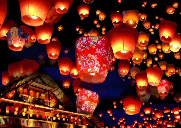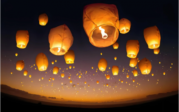 “放天燈”,來由是過去人們在躲避盜匪侵襲而四散逃逸之后,以燃放天燈為互報平安的信號。由于避難回家的日子正是元宵節(jié),從此以后,每年這一天,人們便以放天燈的儀式來慶祝,所以又稱天燈為“祈福燈”或“平安燈”。其后逐漸演變?yōu)橄蛏咸炱砀TS愿的民俗活動。天燈上寫滿了心里的各種祈愿,希望天燈能上達天庭,帶給人無限的希望和光明。
