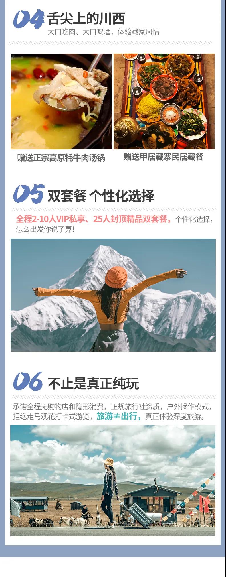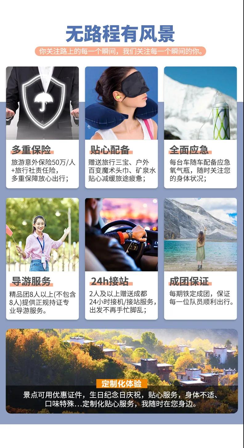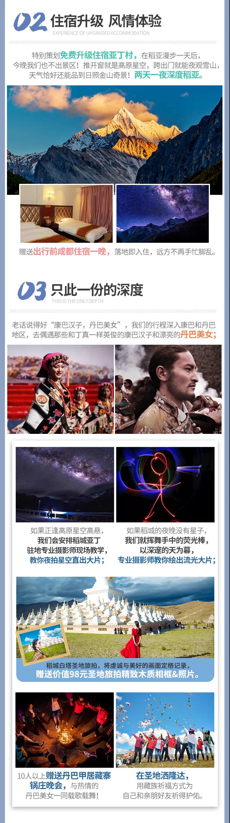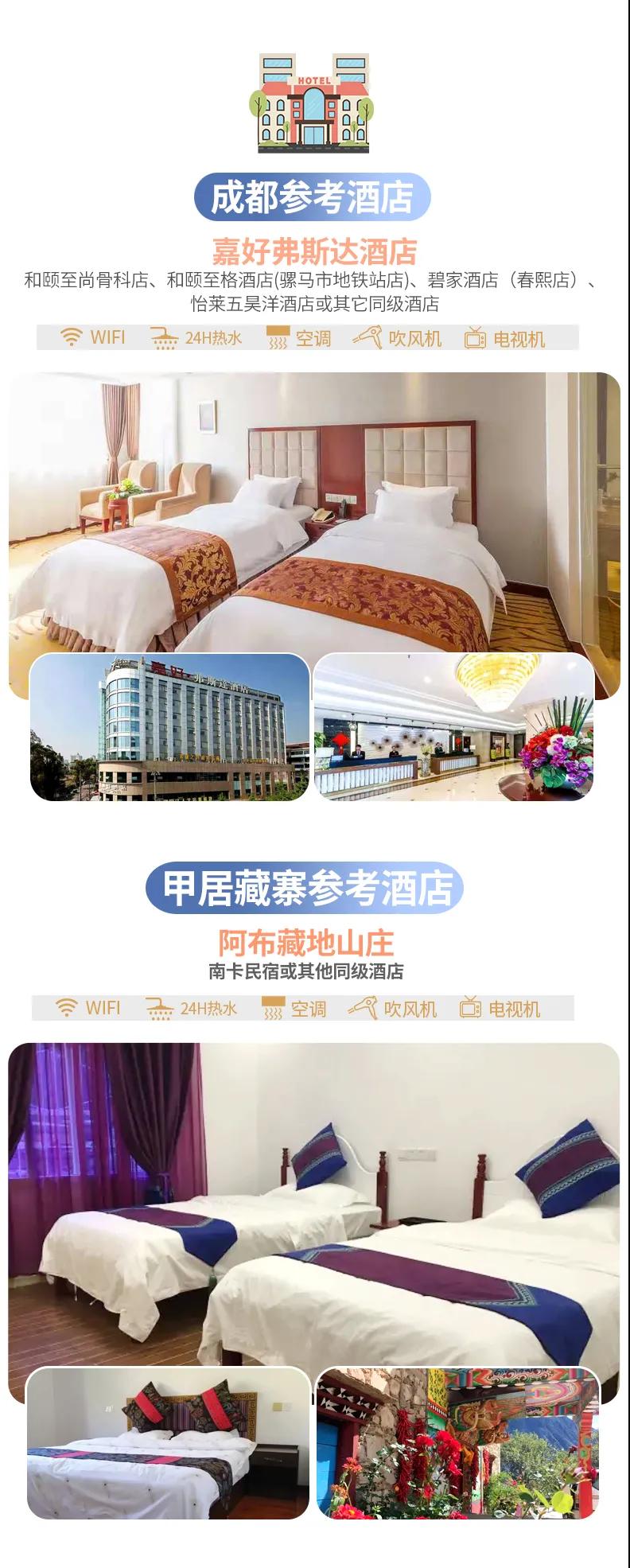 ? 贈送:特色贈送甲居藏寨藏家晚餐、高原特色牦牛湯鍋;贈送旅游三寶、魔術(shù)頭巾、礦泉水緩解旅途疲勞;贈送藏地撒隆達(dá);贈送價值98元圣地旅拍精致木質(zhì)相框&照片;贈送稻城專業(yè)攝影師現(xiàn)場教學(xué)夜拍星空直出大片,沒有星星時則教拍流光大片;10人以上贈送甲居藏寨篝火晚會;贈送成都市區(qū)24小時接機(jī)/接火車服務(wù);贈送項目不用不退。
