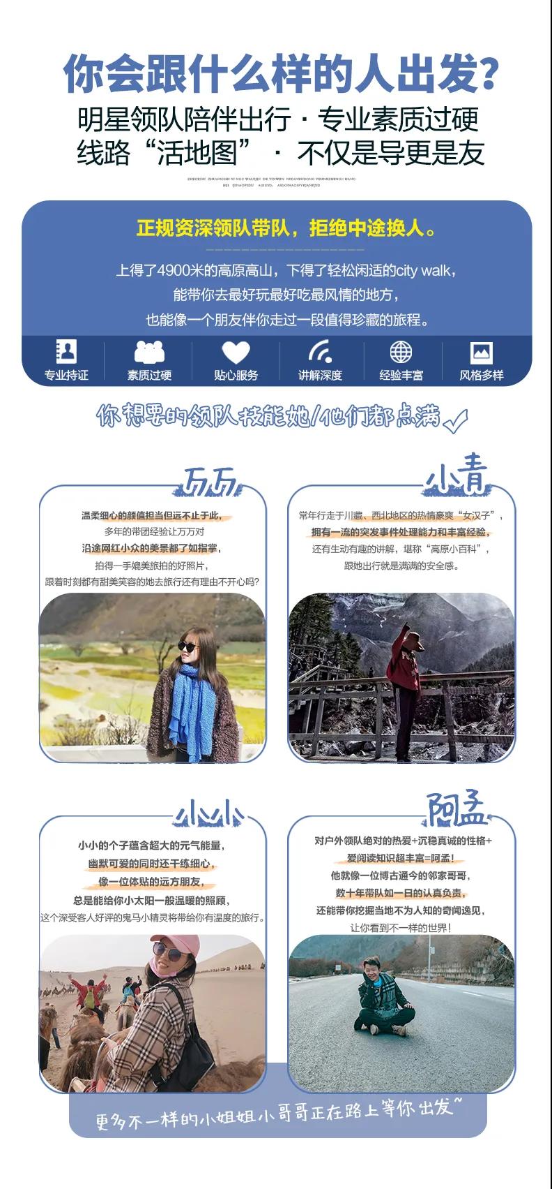 私人訂制:我們客戶范圍囊括了全國各大城市,川西、西北、東北,皖南,貴州,在路上永遠(yuǎn)有我們的身影。我們將為每一個有定制需求的你策劃出獨(dú)屬于自己的完美旅行。