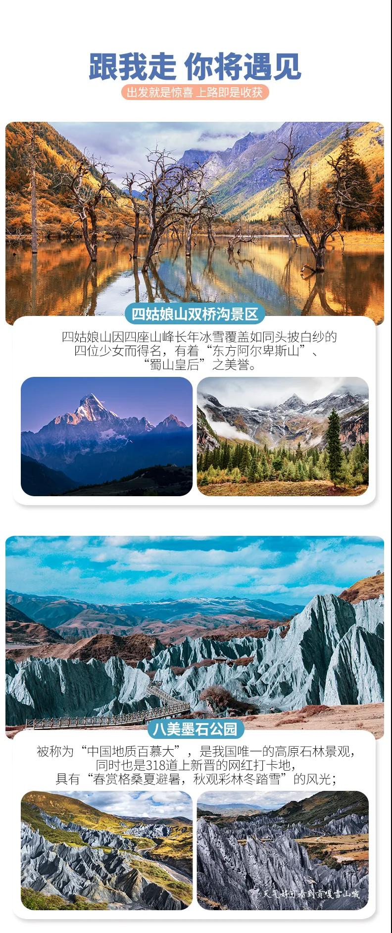 D2 成都 — (約213公里/4.5小時)四姑娘山雙橋溝景區(qū)— (約262公里/8.5小時)丹巴甲居藏寨