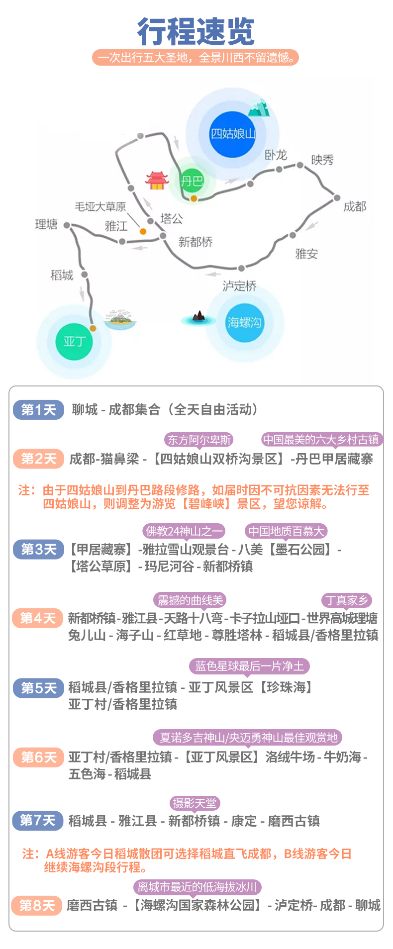 D8 磨西古鎮(zhèn)— (約1公里/4分鐘)海螺溝國家森林公園— (約315公里/5.5小時)成都市區(qū)— 聊城