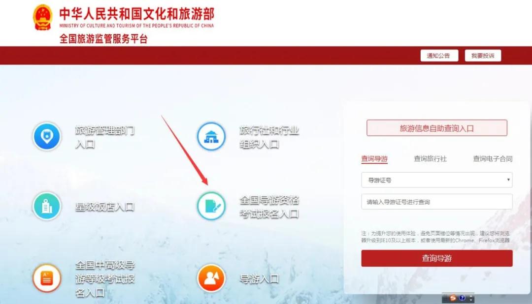 (進(jìn)入“全國(guó)旅游監(jiān)督服務(wù)平臺(tái)”,選擇“全國(guó)導(dǎo)游資格考試報(bào)考入口”入口登錄)