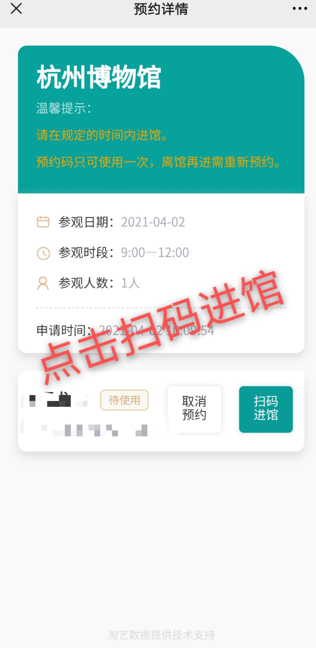 2. 每張有效身份證件每個(gè)時(shí)段限約1次,每次可預(yù)約5人。請(qǐng)務(wù)必截屏保存預(yù)約二維碼(也可通過微信預(yù)約界面進(jìn)入個(gè)人->我的預(yù)約->查看獲取預(yù)約二維碼 )。觀眾到館后通過刷二維碼或預(yù)約的身份證過閘檢票進(jìn)館。