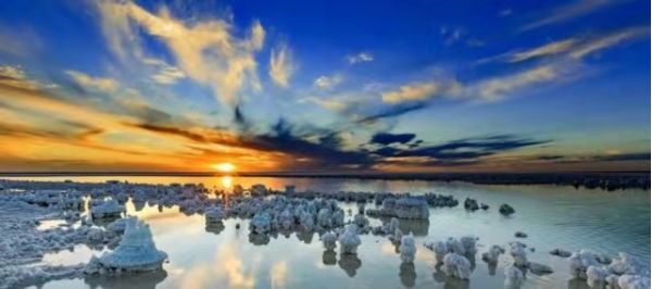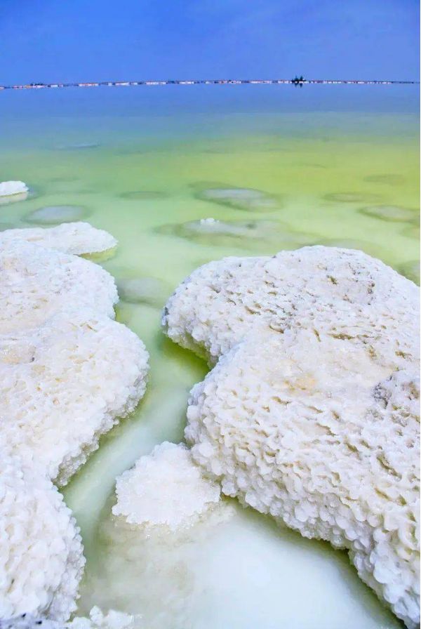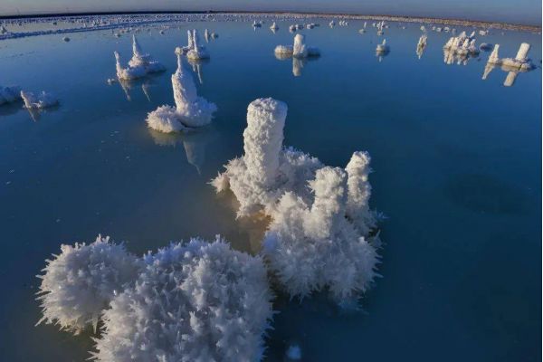 因?yàn)闅夂蜓谉岣稍?,湖水的蒸發(fā)量遠(yuǎn)遠(yuǎn)高于降水量,湖內(nèi)便形成了高濃度的鹵水,然后逐漸結(jié)晶成了鹽粒。而鹽花是鹽湖中的鹽結(jié)晶形成的特殊形狀的結(jié)晶體,由于結(jié)晶時(shí)的溫度,氣候,時(shí)間長(zhǎng)短,濃度不同等原因,形成了各式各樣,萬(wàn)千變化的美麗鹽花。生命的禁區(qū),萬(wàn)物俱寂,但是唯有“鹽花”開(kāi)的最旺,它就是大自然賜給人類(lèi)的絕妙作品,日夜看守這片凈土。這些鹽花無(wú)需人工的雕琢,形態(tài)各異,有的宛如貝殼,有的宛如樓臺(tái),一叢叢,一片片,一簇簇地立于鹽湖中,把鹽湖裝飾得如仙境一般。