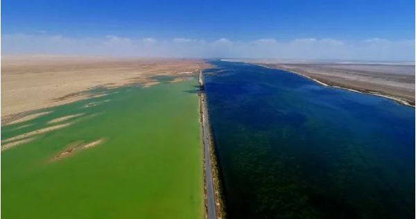 東、西臺(tái)吉乃爾湖,在一條狹長的棕黃色鹽堿土路兩側(cè),呈現(xiàn)出一邊碧綠,一邊青翠,截然相反的絕美水色。
