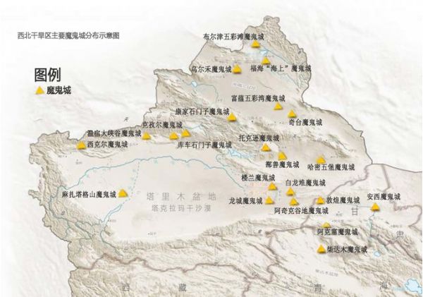 從地圖上我們可以明顯看到,北疆是魔鬼城的主要分布區(qū)域,甘肅、青海也有少量分布,實(shí)際上,在西北資料可查的雅丹地貌群就近百余處,它們一個(gè)個(gè)神秘地屹立在西北疆域上,成為了寂寞荒原上的一場(chǎng)視覺盛宴,數(shù)量之多,形態(tài)之多,就像是一個(gè)神秘而龐大的“魔鬼”家譜,實(shí)際上,它們并不是被人類遺棄或鬼神建造的“古城”,而是經(jīng)過風(fēng)蝕形成的一種特有地貌景觀,用我的話講就是被風(fēng)吹了多少年的一堆大土丘~可是深入其中,高高低低的“建筑群”投下錯(cuò)亂光影,在這里幾乎看不到任何生命的跡象,因?yàn)殍F含量過高,磁場(chǎng)不穩(wěn)定, 指南針進(jìn)入雅丹地貌經(jīng)常會(huì)不管用,尤其在夜深人靜,遇到風(fēng)吹,聲音似鬼哭狼嚎,極其陰森恐怖,故被稱為“魔鬼城”。如果晚上在魔鬼城里露宿一夜,想必也會(huì)是一種奇妙的體驗(yàn)~