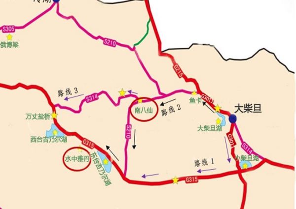 線路2:大柴旦南下高速G3011,沿“中國(guó)66號(hào)公路”之稱的315國(guó)道一直向西,沿途路過察爾汗鹽湖,這條路線路程短,車稍多,注意車速。