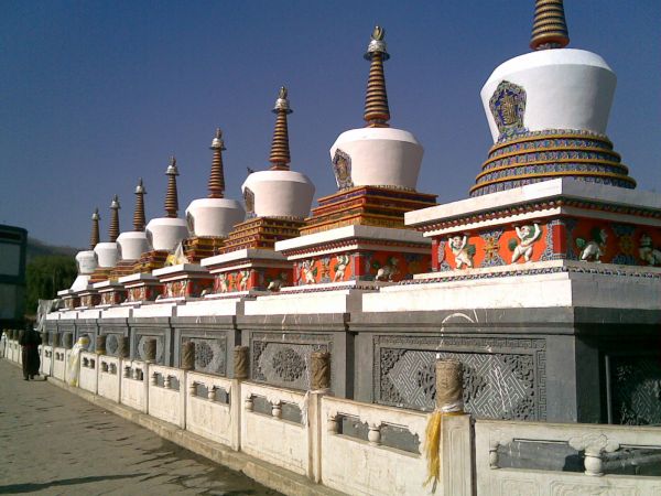 大拉浪由經(jīng)堂、華門、牌坊3座殿堂組成,為漢藏合璧式建筑,是塔爾寺總法臺的居住處,達賴、班禪曾駐蹕于此。居巴扎倉(密宗學院)系藏式平頂建筑。曼巴扎倉、丁科扎倉屬漢藏結(jié)合建筑。寶塔數(shù)十座,其中并列于寺前的8座如意寶塔,方座,瓶形塔身,尖頂,根據(jù)釋迦牟尼一生重要經(jīng)歷和傳說建成。 最后終于有了塔爾寺。