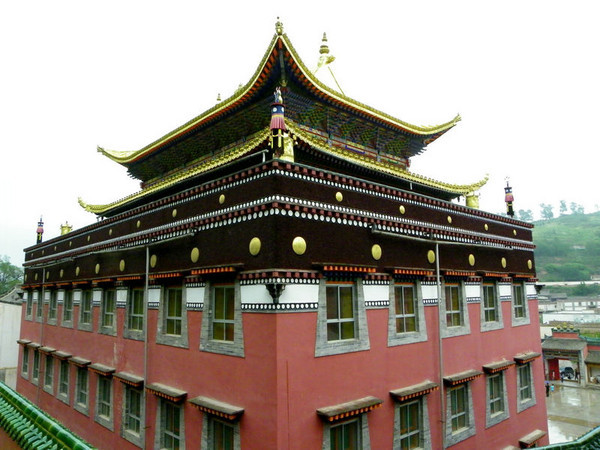 小金瓦寺藏語稱"旃康",是塔爾寺的護法竦睿?ㄓ諉鞒珈跛哪?1631)。殿分上下3層,底層和中層面闊七間,進深五間。底層為三面封閉的殿堂,中層為明窗式,在藏式雙層平頂建筑上增建面闊三間的漢式歇山頂單檐建筑,清嘉慶七年(1802)改為鎏金銅瓦頂。殿內(nèi)有佛像、鎏金寶塔、經(jīng)卷、白馬標本等。院內(nèi)兩側(cè)和前方有繪滿各式壁畫的壁畫廊,為兩層藏式建筑。