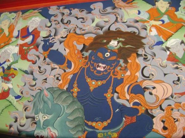 壁畫,是各個殿宇墻壁上繪畫,它大多繪于布幔上,也有的直接繪于墻壁和棟梁上。壁畫的染料采用天然石質(zhì)礦物,因此具有色澤鮮艷,經(jīng)久不變的特點。塔爾寺的壁畫屬喇嘛教畫派,因此具有濃厚的印、藏風味。壁畫內(nèi)容,人物主次多屬密乘教義,畫面構(gòu)想巧妙,布署適然,色調(diào)和諧,工藝精湛,手法細膩。