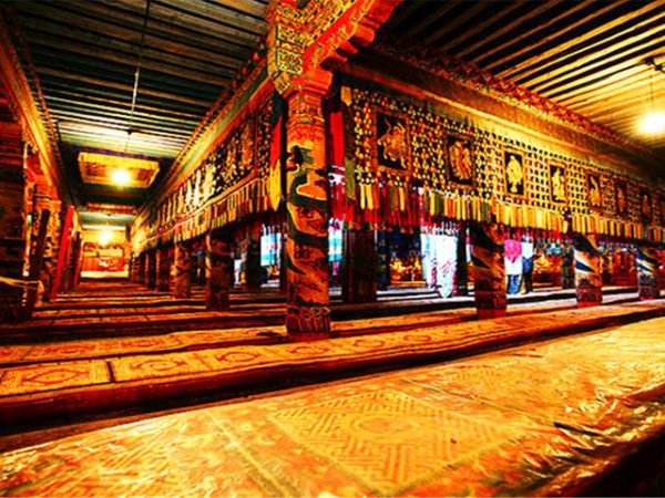 大經(jīng)堂始建于明萬歷三十四年(1606),毀于火,1917年重建。土木結(jié)構(gòu),為藏式雙層平頂建筑,漢式樓閣遙相互映。經(jīng)堂面闊十三間,進深十一間。面積1981平方米。堂內(nèi)四壁存放著數(shù)百冊經(jīng)卷。