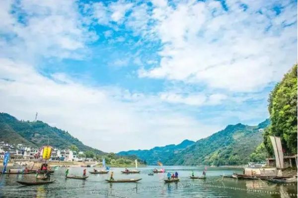 7:00準時集合出發(fā),約8:30到達深渡碼頭,乘坐畫廊游船,這是一條聞名中外的“唐詩之路”,今有“山水畫廊、清涼世界”的美譽。它像一條閃閃發(fā)亮的銀練,穿行于錦峰秀嶺、山鄉(xiāng)古建筑之間。兩岸點綴著粉墻黛瓦的徽派建筑,當清晨晨霧縈繞抑或傍晚炊煙裊裊之時,頗有中國水墨山水畫的味道。