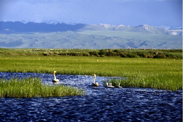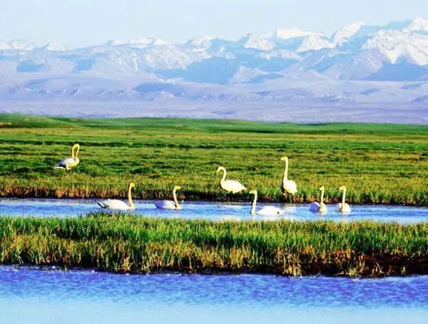 每逢春末夏初,冰雪消融,大地復蘇,旅居在印度、緬甸、巴基斯坦甚至遠到紅海和地中海沿岸諸國的天鵝和雁鷗,不遠千里成群結隊地飛到這里筑巢、換羽、求偶、生兒育女、棲息繁衍。這就是我國著名的巴音布魯克天鵝湖自然保護區(qū)。