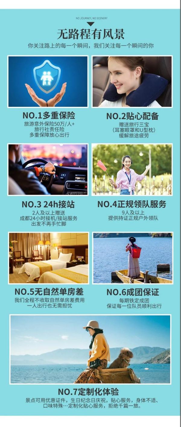 1、關(guān)于車輛交通:目前四川旅游市場(chǎng)8座以下車輛無法辦理旅游牌照,請(qǐng)游客知悉,以此理由提起的投訴我方拒不受理,望您諒解。