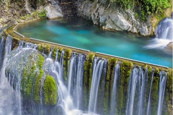 螺髻山九十九里溫泉不僅是世界第一大溫泉瀑布,還是世界唯一的掛壁溫泉、世界唯一的溫泉群島,由數(shù)十個(gè)大小不一的溫泉瀑布組合而成的一個(gè)寬達(dá)200余米的溫泉瀑布群。首先映入眼簾的是一泓清澈見底的大槽河,河流纏繞在青山綠水間,漫步在奔騰而下的大槽河畔,陣陣涼風(fēng)夾雜著水霧撲面而來,郁郁蔥蔥的山嶺上百瀑飛瀉,雄奇的靈崖異石,成群的瀑布形態(tài)各異;順著河流而上,聲響如雷,一簾高31米寬19米掛在懸崖峭壁之上的溫泉瀑布呈現(xiàn)在了眼前,銀簾空懸而掛,蒸騰彌漫、熱霧繚繞;崖壁上的天然小水池,被稱之為“鴛鴦池”,沐浴其間,聽滴水彈琴,享靈崖泉韻,觀簾外景物,撲塑迷離,恍若大虛幻景。